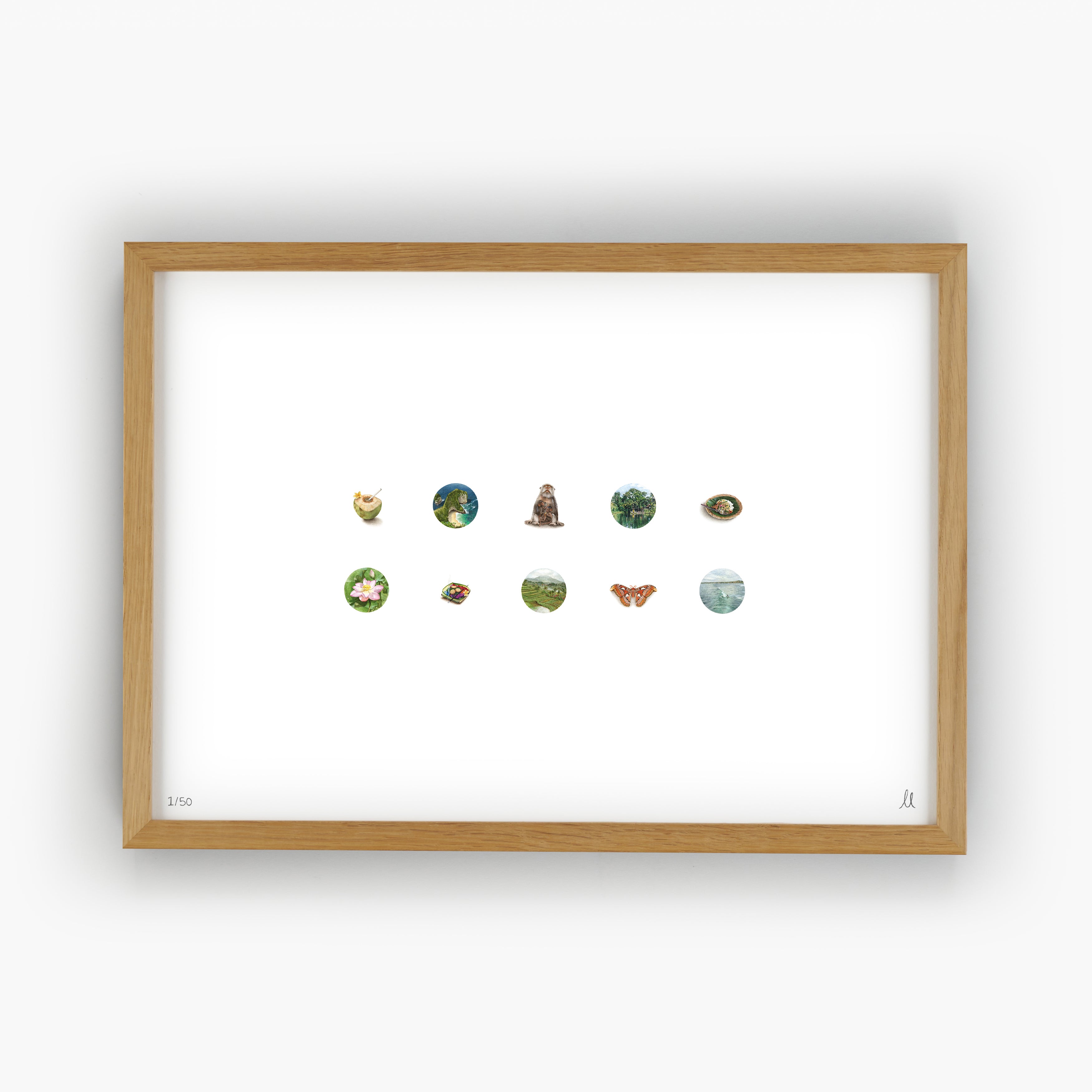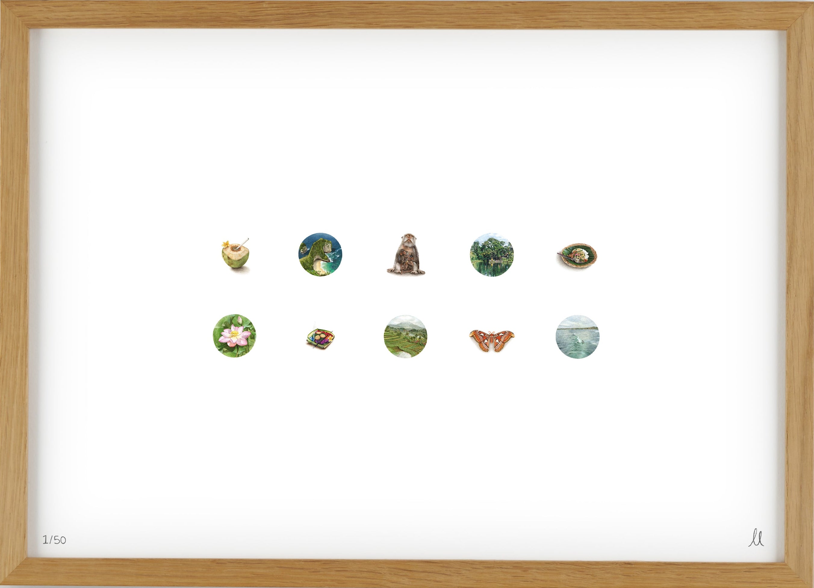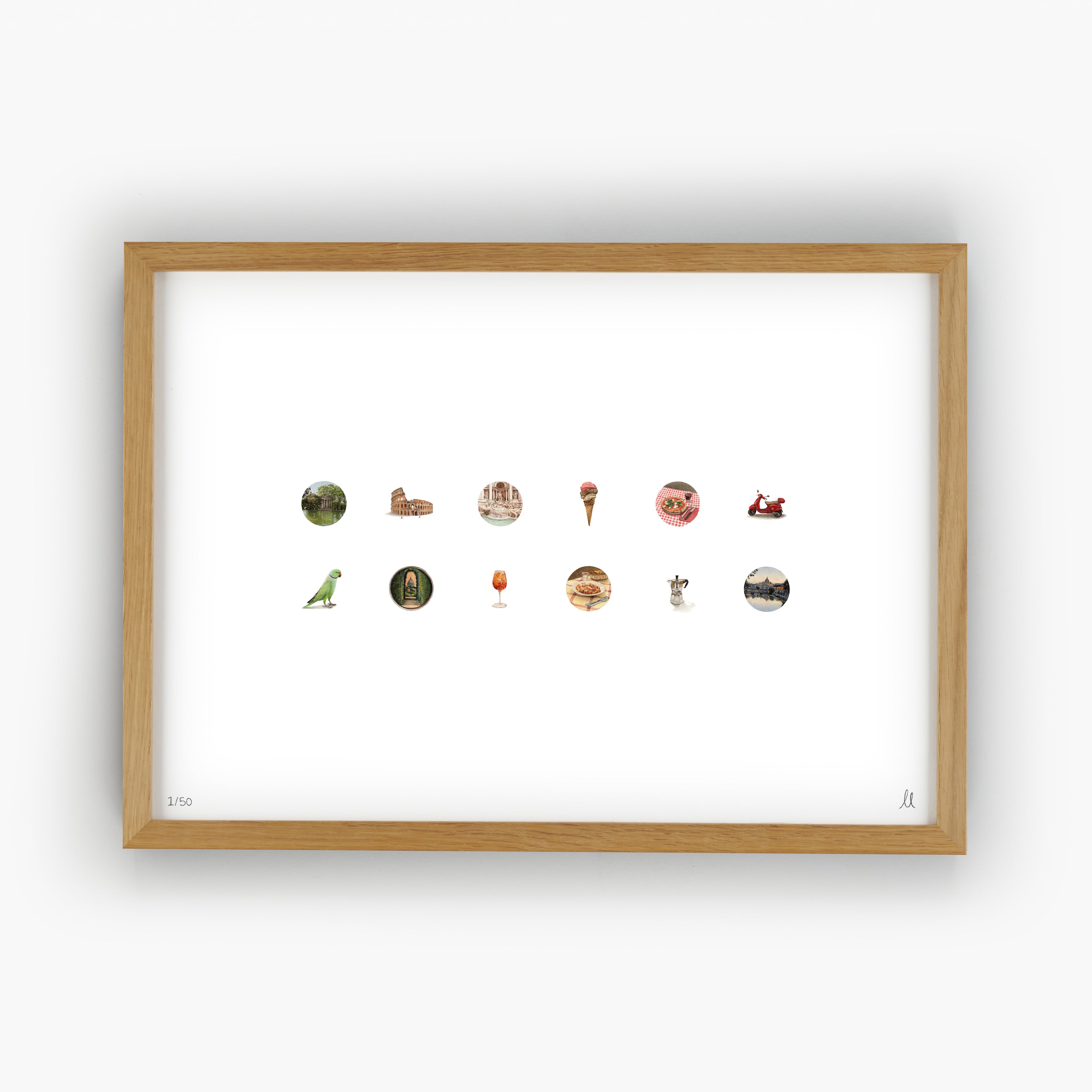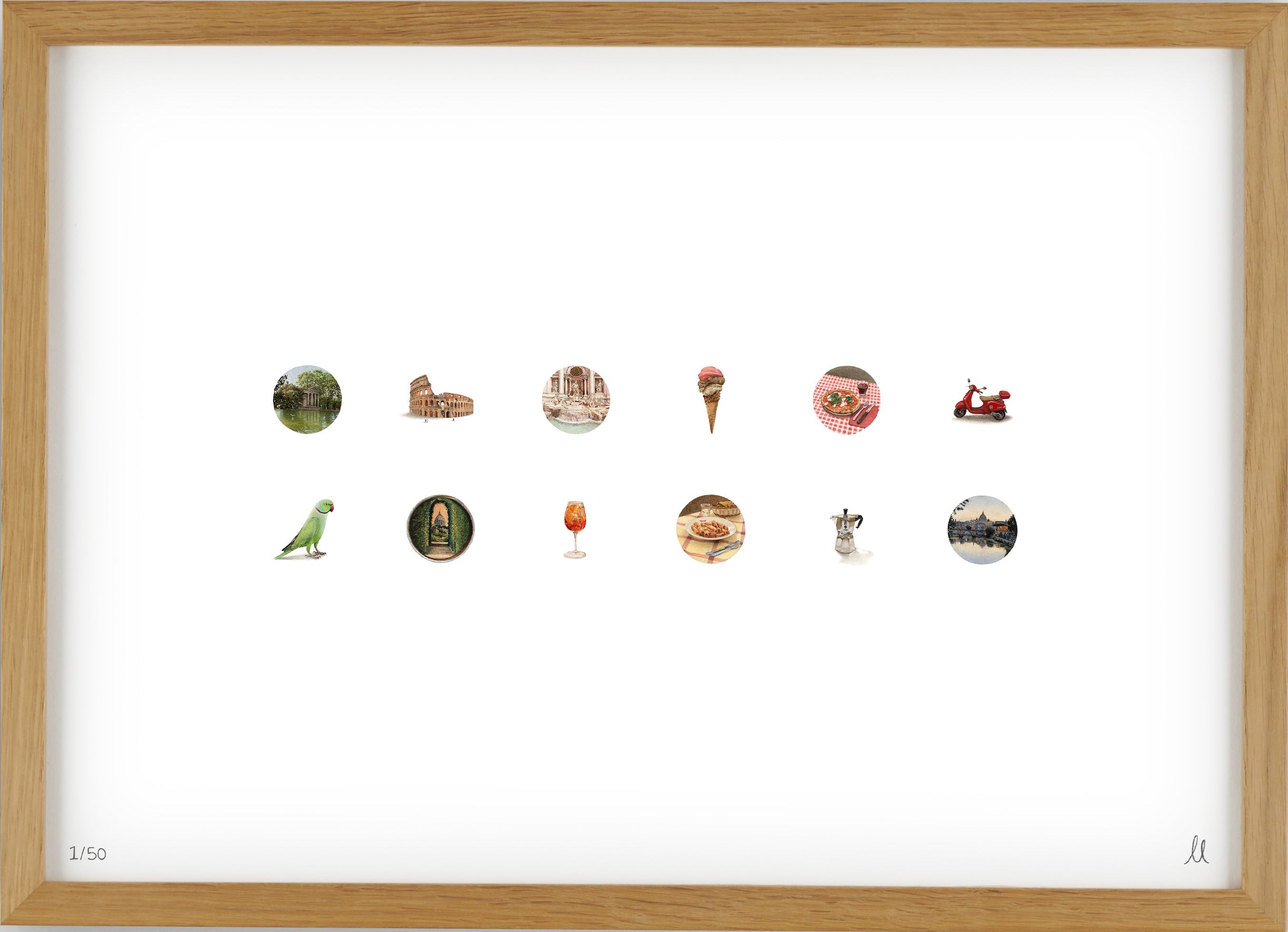 These prints reflect my recent travels, featuring collections of miniature paintings inspired by the magic and soul of Bali, and the iconic food, culture and sights of Rome.
